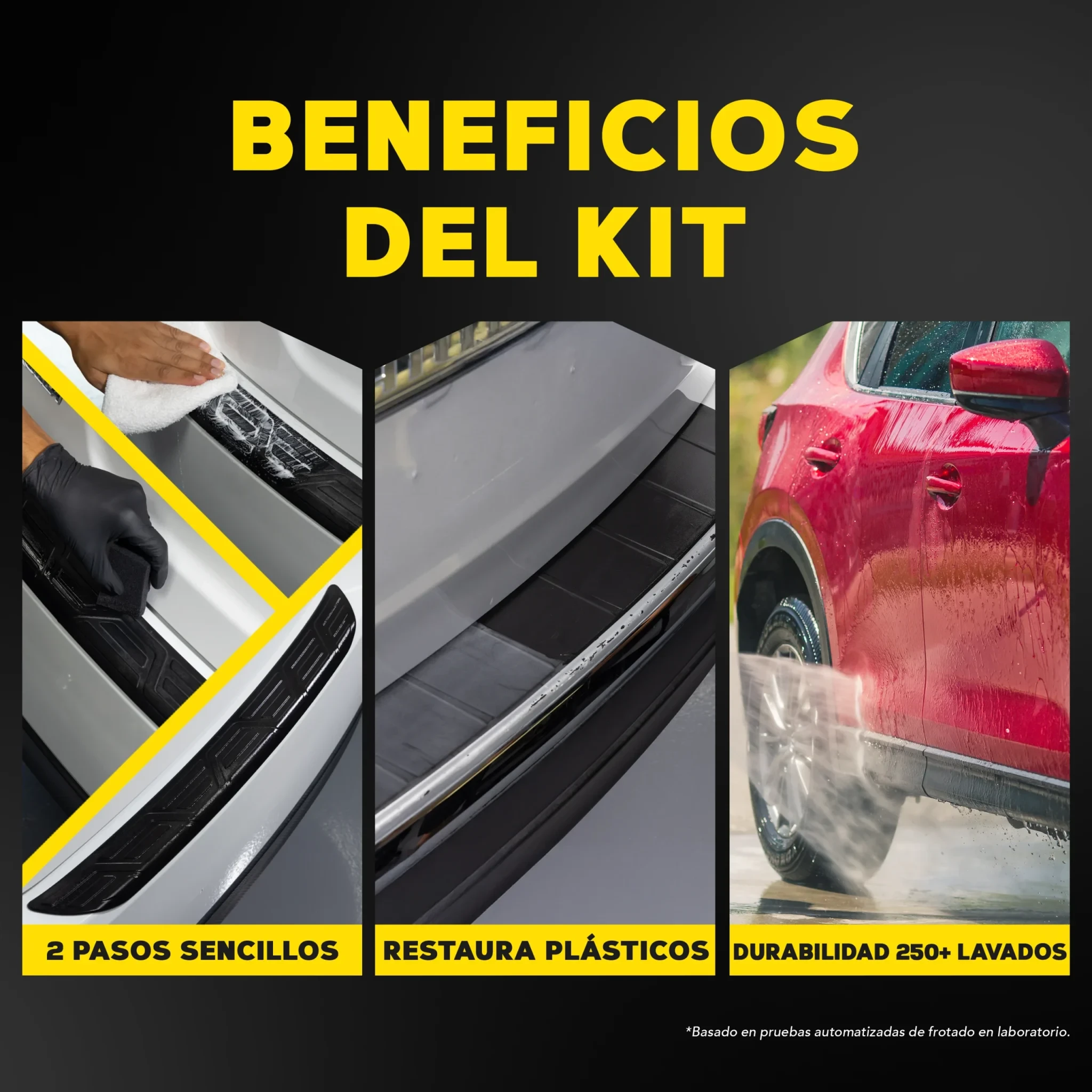 Ofrece una durabilidad superior, con resistencia de hasta más de 250 lavados. Este kit avanzado para la restauración de plásticos exteriores incluye un limpiador y un protector especialmente formulados para trabajar en conjunto.
