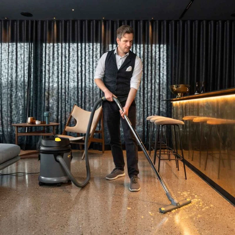 La aspiradora industrial Karcher NT 27/1 1.428-500.0 es una máquina compacta y potente con depósito de plástico de 27 litros, diseñada para limpiezas profesionales en talleres pequeños, lavado de sofás medianos, colchones y detailing automotriz. Su turbina de 1380 W máximo genera una depresión de 24.9 kPa y caudal de 72 l/s para aspirar polvo fino, escombros ligeros y líquidos en espacios reducidos.
