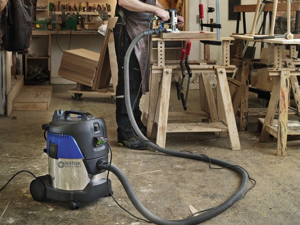 La aspiradora industrial Nilfisk Aero 21 Inox es una máquina profesional con depósito de acero inoxidable de 20 litros, diseñada para limpiezas pesadas en talleres, lavado de sofás grandes, colchones y servicios automotrices. Su motor de 1250 W máximo genera una depresión de 21 kPa y flujo de 3600 l/min para aspirar polvo fino, virutas, escombros y líquidos en volúmenes altos.