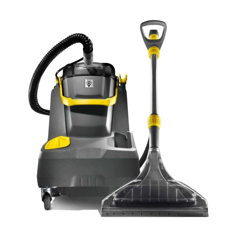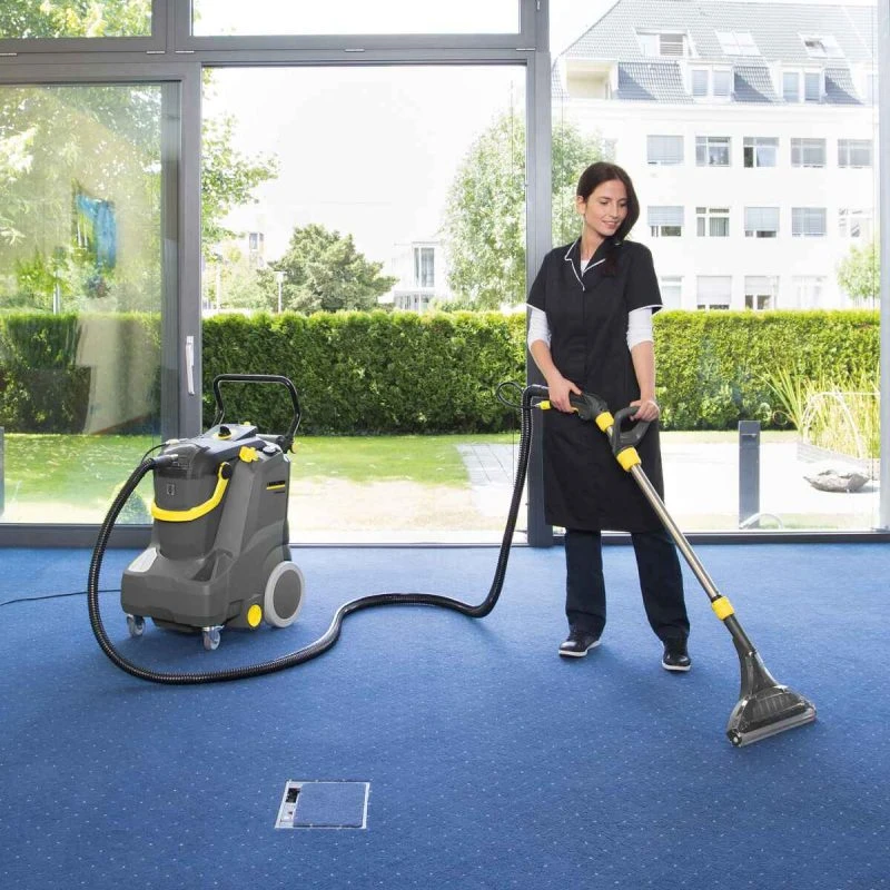 La Kärcher Puzzi 30/4 rocía con 4 bar presión profesional y aspira con turbina 1200W, eliminando ácaros, sudor y suciedad de colchones king/queen size en 20-30 minutos por unidad. Sus tanques industriales 30L limpia + 15L sucia extraíble permiten limpiar 4-5 colchones grandes sin rellenar/vaciar, perfecto para servicios de limpieza de dormitorios completos. La boquilla ancha de 350 mm cubre colchones enteros en pocas pasadas y limpia tapizados de sofás modulares o vans comerciales.