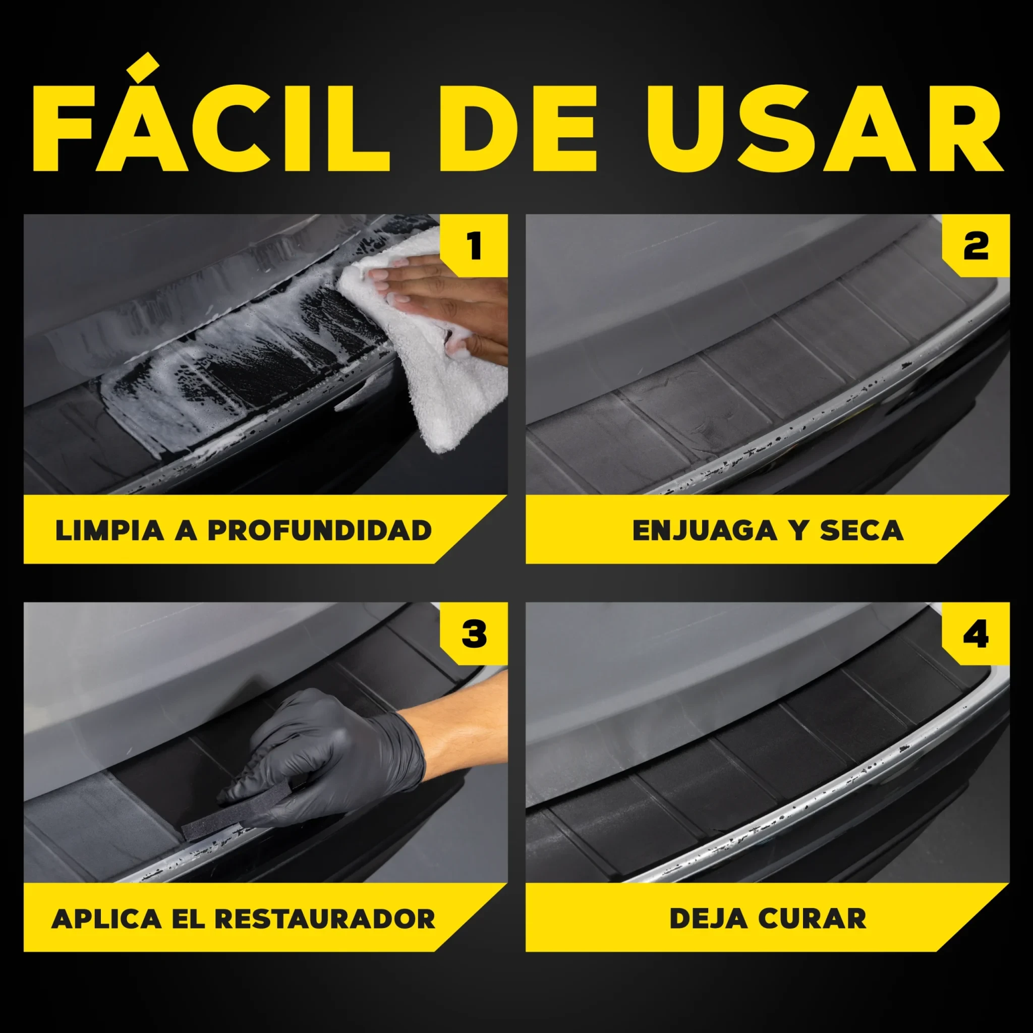 Destaca por su alta resistencia, superando el desempeño de los restauradores convencionales. Además, su aplicación es sencilla y rápida: primero se limpia profundamente la superficie y luego se aplica el protector para restaurar, revitalizar y conservar los plásticos exteriores.
